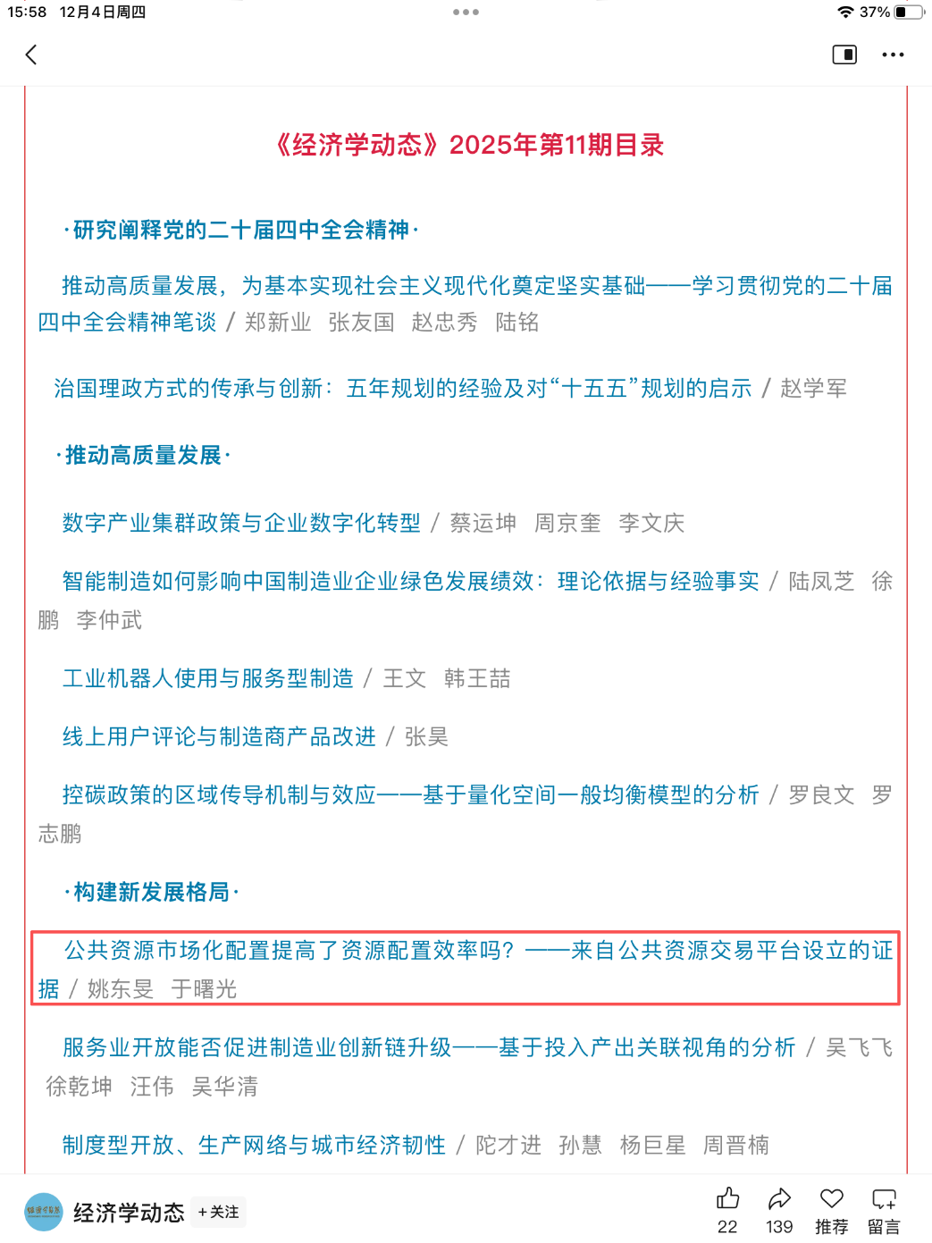 中心师生论文《公共资源市场化配置提高了资源配置效率吗?——来自公共资源交易平台设立的证据》在《经济学动态》2025年第11期刊发