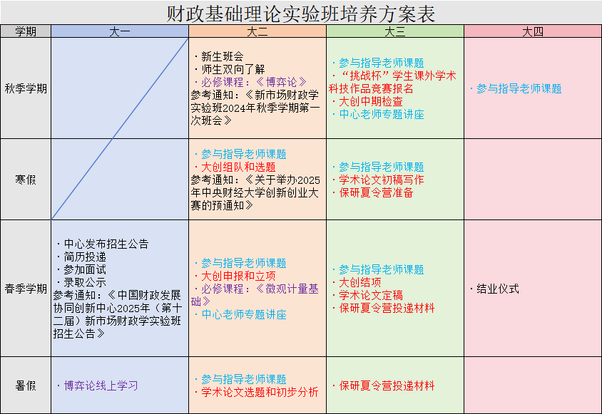 新学年伊始,财政基础理论实验班迎来全新起点。中国财政发展协同创新中心(以下简称“中心”)在系统推进实验班培养体系改革的基础上,正式推出全新编制的《实验班培养方案表》,以简洁直观的表格形式呈现优化后的培养路径,为实验班再启程提供清晰明确的行动指引。