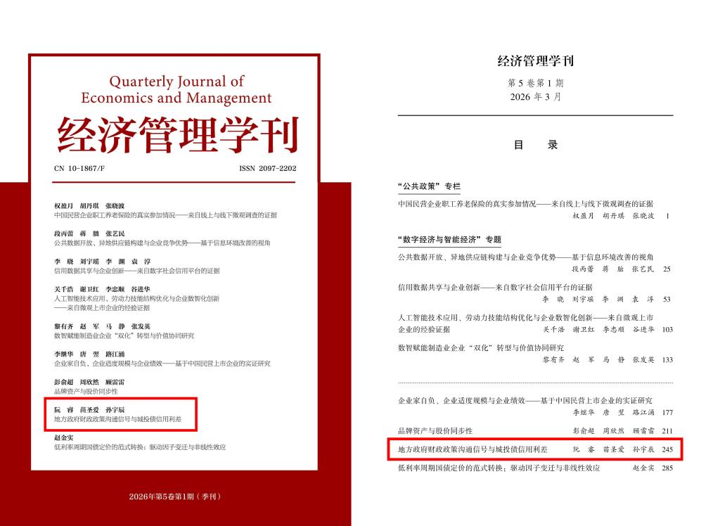 近日,由中国财政发展协同创新中心(简称“中心”)硕士生苗圣爱,中心副教授阮睿、对外经济贸易大学中国金融学院副教授孙宇辰共同撰写的论文《地方政府财政政策沟通信号与城投债信用利差》在我校A类学术期刊《经济管理学刊》2026年第1期刊发。