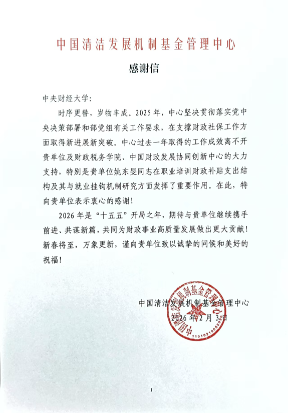 近日,中国清洁发展机制基金管理中心(以下简称“清洁基金”)致信我校,对我校长期以来在财政政策研究与人才培养方面给予的大力支持表示感谢。信中还特别肯定了中国财政发展协同创新中心主任姚东旻教授在职业培训财政补贴支出结构及其与就业挂钩机制研究中所作出的重要贡献。