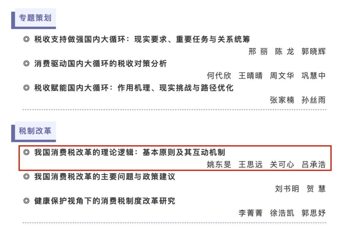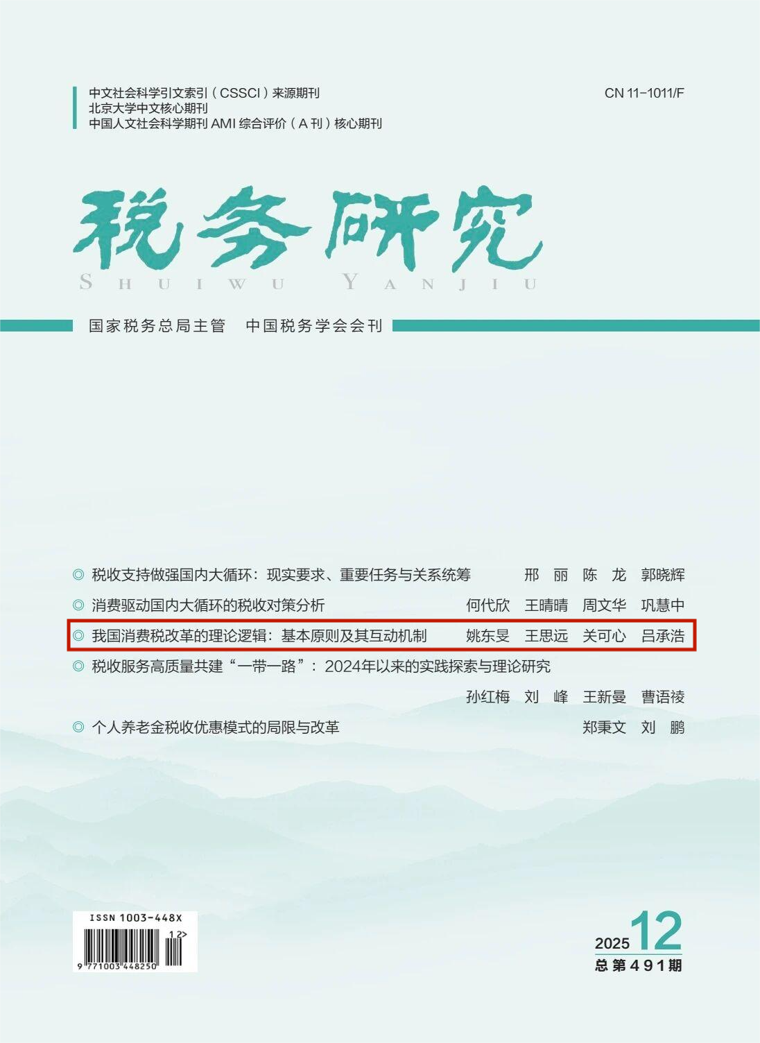 近日,由中国财政发展协同创新中心(简称“中心”)教授、博士生导师姚东旻,中心博士生王思远、关可心,中心硕士生吕承浩共同撰写的论文《我国消费税改革的理论逻辑:基本原则及其互动机制》在我校A类学术期刊《税务研究》2025年第12期作为封面文章刊发。