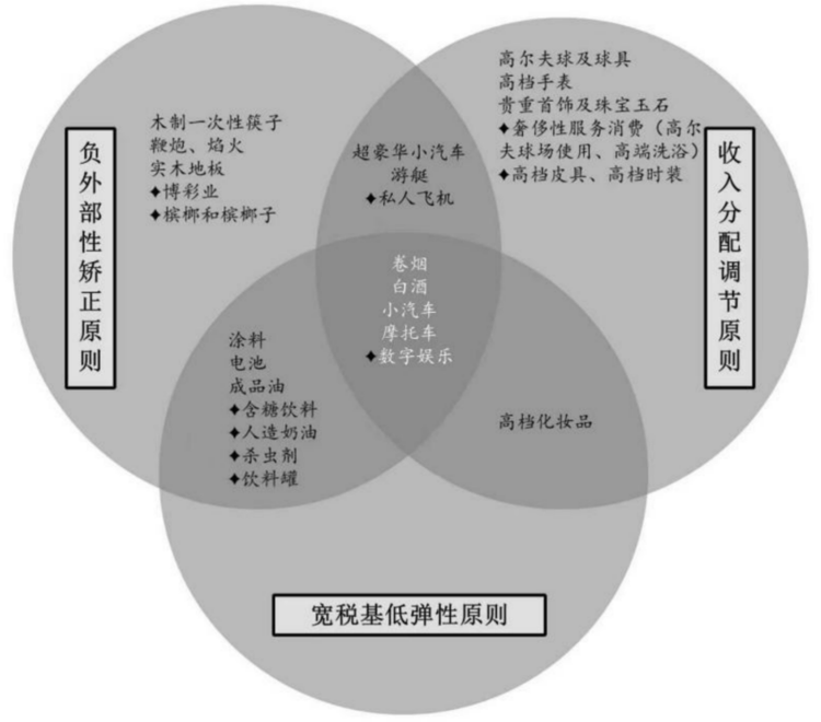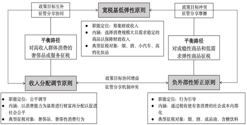 负外部性矫正原则旨在通过税收手段让消费行为带来的不良社会成本由消费者承担,以实现抑制有害消费和引导绿色发展的政策目标。一方面要求将课税对象聚焦于具有显著健康或环境负外部性的商品或服务,通过科学划定税目与设置差异化税率;另一方面强调在征管与收入分享机制中体现生产地或消费地所承担的负外部性影响并给予合理补偿。收入分配调节原则旨在通过对非生活必需高档消费品征收消费税,并结合横向公平导向的征管与收入分享机制,实现社会财富再分配。一方面要求将非必需、高溢价消费品纳入征税范围并通过差异化累进税率实现纵向公平;另一方面要求在征管和收入分享机制上以消费地原则为核心,并适当下划地方,实现横向公平。税基低弹性原则要求选择消费规模大、需求稳定的商品作为征收对象,以确保财政汲取能力的可持续性。“宽税基”要求将受众广泛、消费体量大且品类多样的消费品纳入征税范围;“低弹性”强调对需求弹性小的消费品课税。负外部性矫正与收入分配调节既存在协同也存在摩擦。