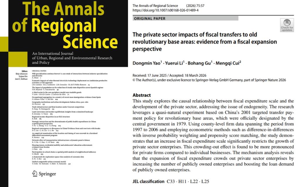 近日,由中央财经大学中国财政发展协同创新中心(简称“中心”)主任、教授、博士生导师姚东旻,财政税务学院毕业生李玥睿,中心博士生顾博航,中心毕业生崔孟奇共同撰写的论文在我校A类学术期刊《The Annals of Regional Science》2026年第75卷第2期刊发。该研究围绕转移支付带来的财政支出扩张展开分析,从县域层面考察财政支出规模变化对民营经济主体发展的影响,为理解财政政策的资源配置效应提供了新的经验证据。